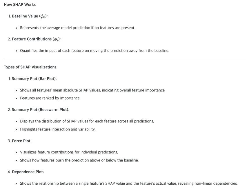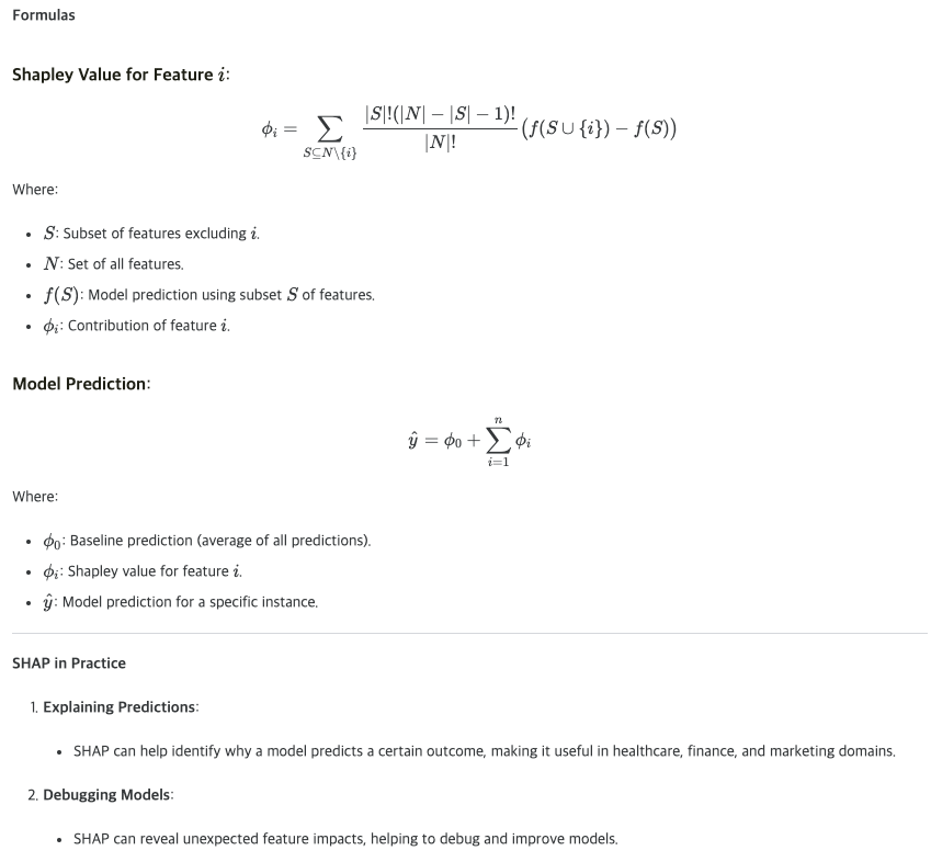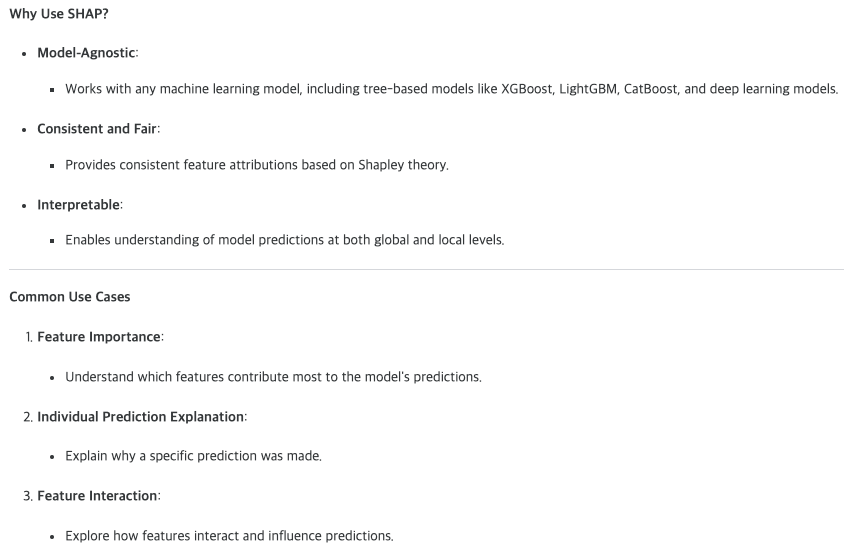 - It is based on cooperative game theory and provides insights into the contribution of each feature to a model's predictions.