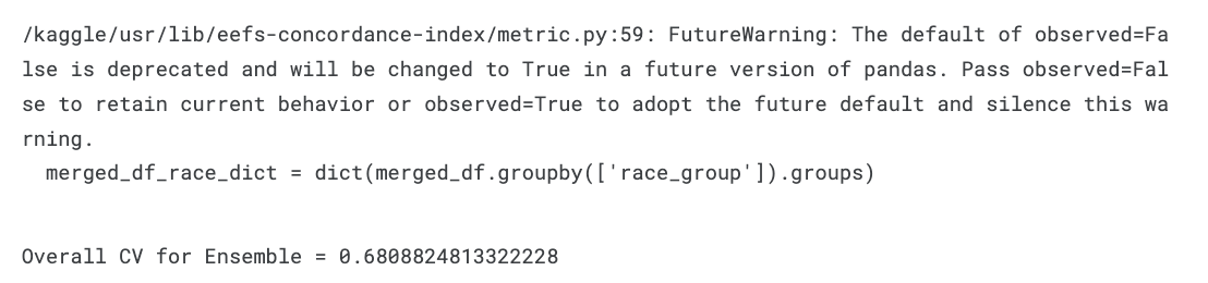 - We ensemble our XGBoost, CatBoost, LightGBM, XGBoost Cox, and CatBoost Cox using scipy.stats.rankdata() and achieve an amazing CV=0.681 Wow!