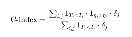 - The denominator counts all pairs of dots where we know ground truth T_j < T_i where T is the actual time without event (note when efs=0 then actual time without event > efs_time and when efs=1 then actual time without event = efs_time).