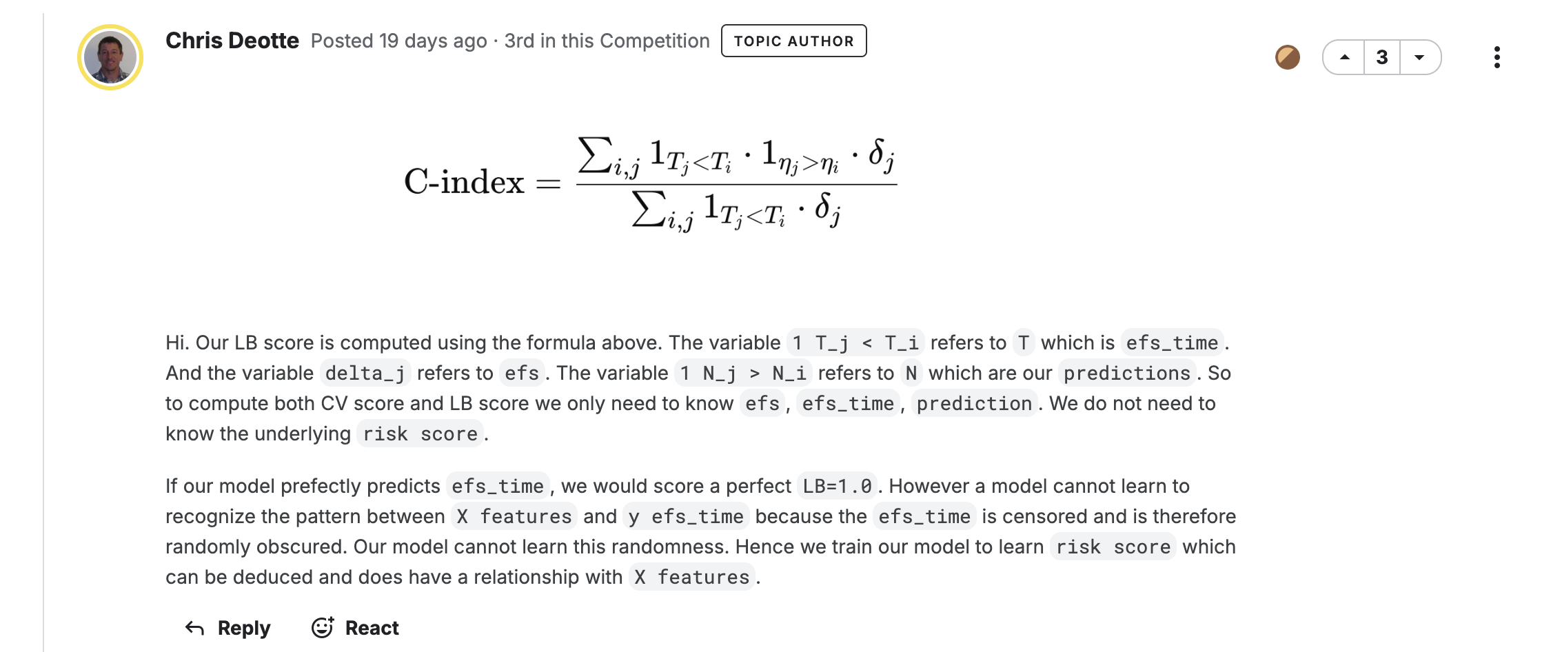 - Misunderstanding: Thought that all efs=0 patients should have lower risk scores than efs=1 patients