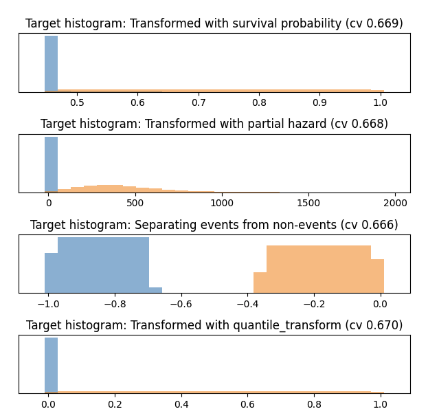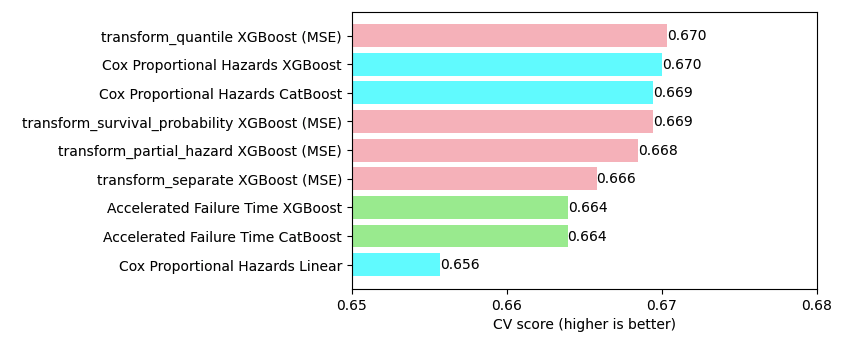 - A comparison with other model types shows that target-transformed mse models (pink) are competitive with Cox proportional hazards models (blue).