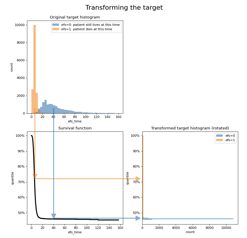 - The original target is distributed in such a way that most patients who die have an efs_time between 0 and 15, whereas most survivors have an efs_time between 15 and 160.