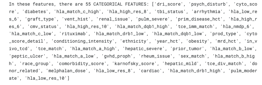 - Therefore in my NN starter, I convert 55 features into categorical leaving only donor_age and act_at_hct as numerical.