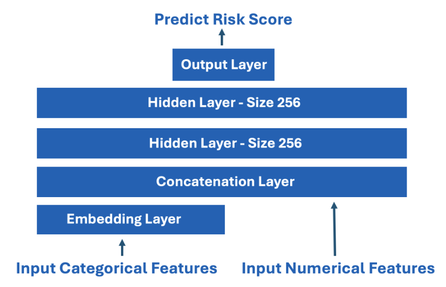 - Afterward we concatenate all the categorical embeddings together with the numerical features and continue forward with MLP.