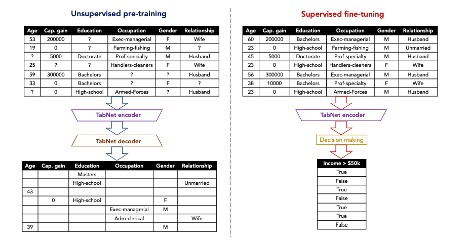 "TabNet inputs raw tabular data without any preprocessing and is trained using gradient descent-based optimization, enabling flexible integration into end-to-end learning."
