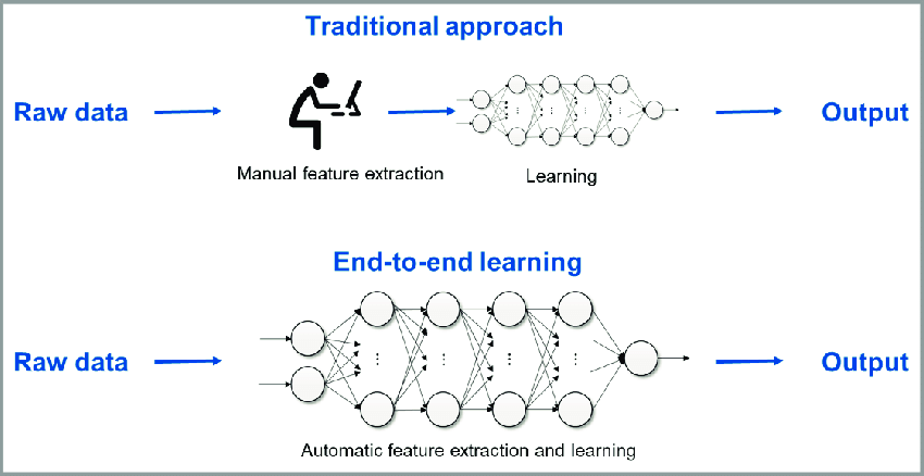 - Refers to a deep learning approach where a single network learns all steps from input to output without manual feature extraction or intermediate processing stages.
