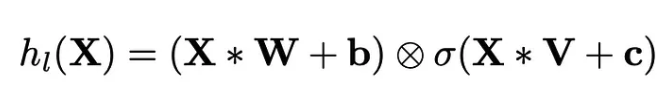 - Second formula indicates that the output of the linear mapping from the FC layer splits in two and fed into two parts: A into residual connection(direct linear transformation), B into sigmoid function. And then, multiply A and σ(B) element by element (⊗).