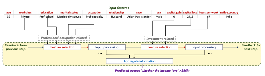 - We can see how TabNet uses sequential attention to predict the income: first learns from professional occupation related features in the first decision step, then moves on to investment-related features in the next step.