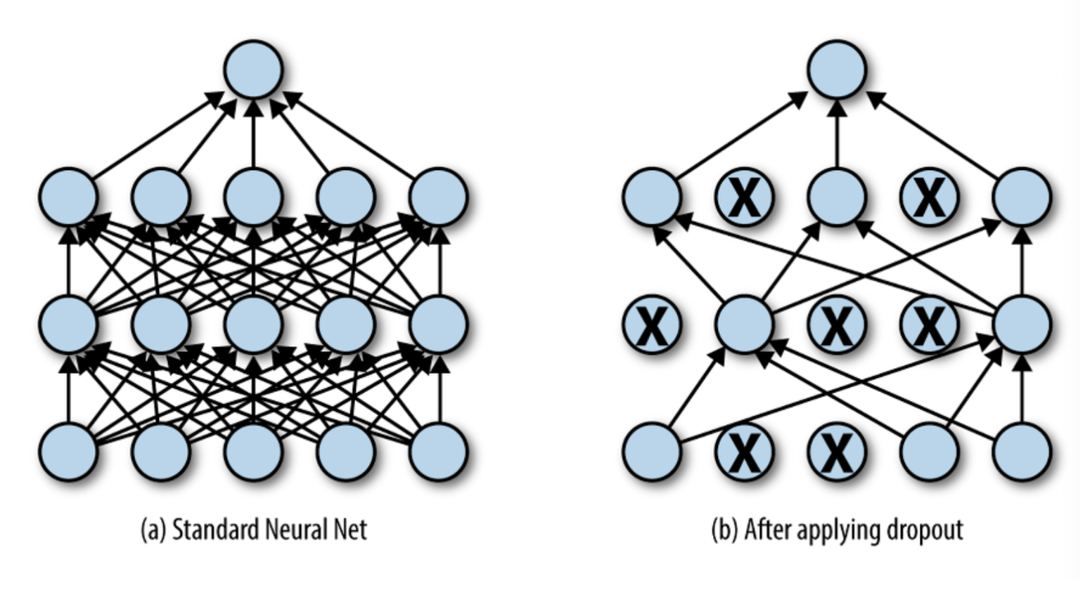 - They simply randomly set some neurons' outputs to 0 and increase the remaining neurons' outputs by dividing them by the non-dropout rate.