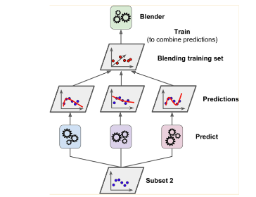 - Next we should make a new dataset(blending training set) with 1. predicted result 2. target value for blending model and train the blending model.