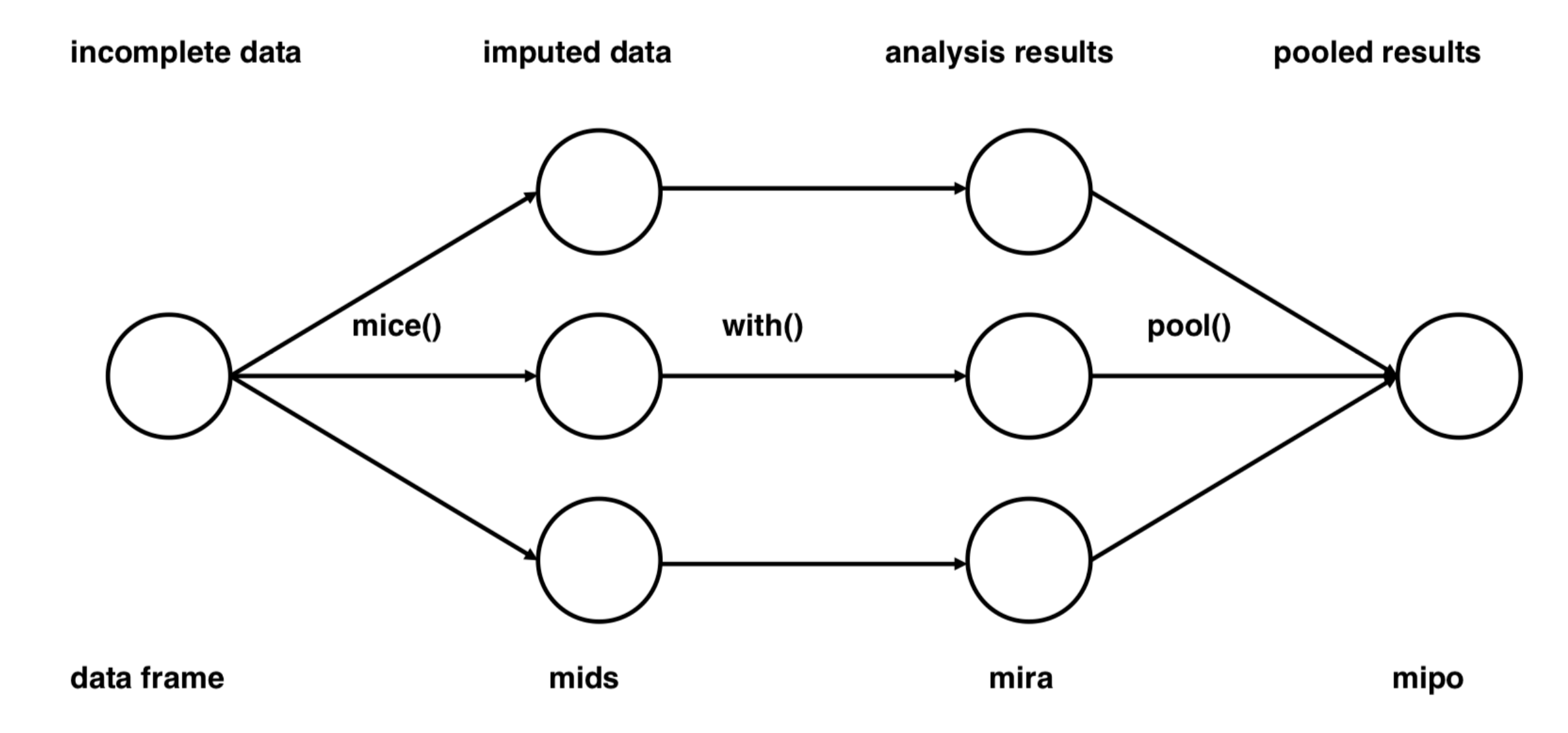 - Statistical modeling is performed using the 'with' function and the results are obtained by averaging m imputation sets using 'pool' function.