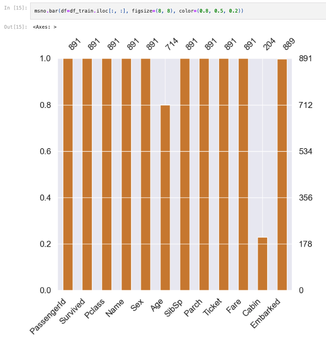 msno.bar(df=df_train.iloc[:, :], figsize=(8, 8), color=(0.8, 0.5, 0.2))