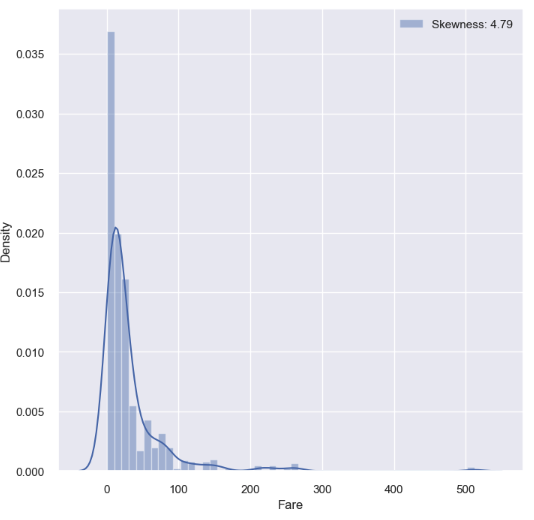 g = sns.distplot(df_train['Fare'], color='b', label='Skewness: {:.2f}'.format(df_train['Fare'].skew()), ax=ax)