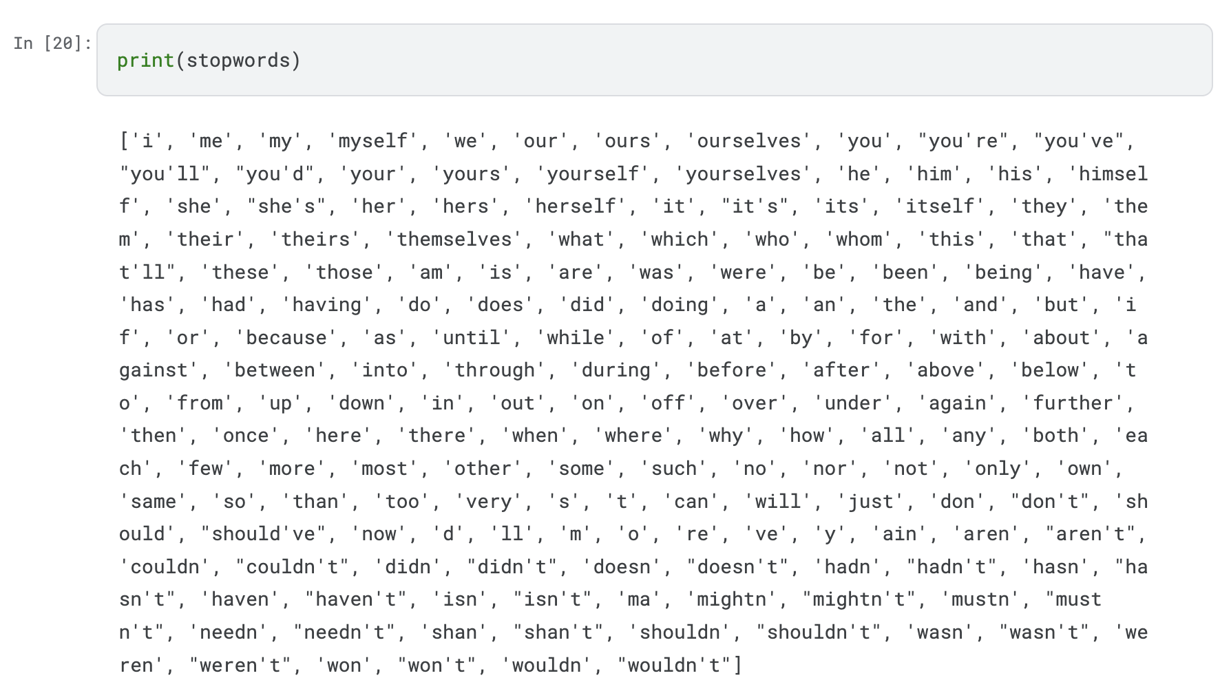 - Conveniently, NLTK comes with a predefined list of 153 english stopwords.