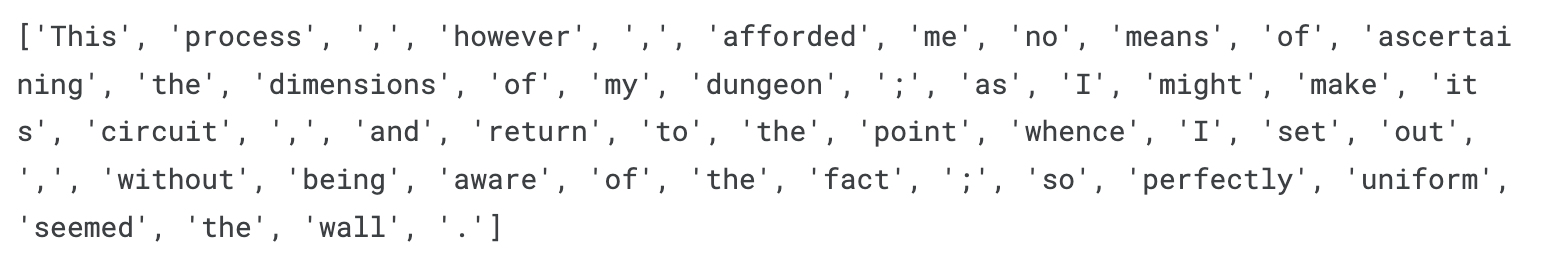 - There is a convenient method "word_tokenize( )" (TreebankWord tokenizer) which strips out singular words as well as punctuations into separate elements automatically as follows: