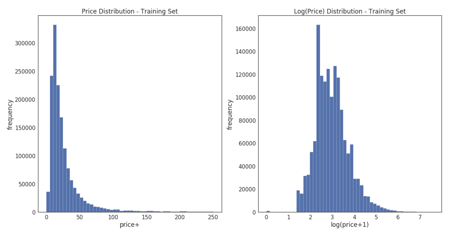 - So let's make log-transformation on the price (we added +1 to the value before the transformation to avoid zero and negative values).