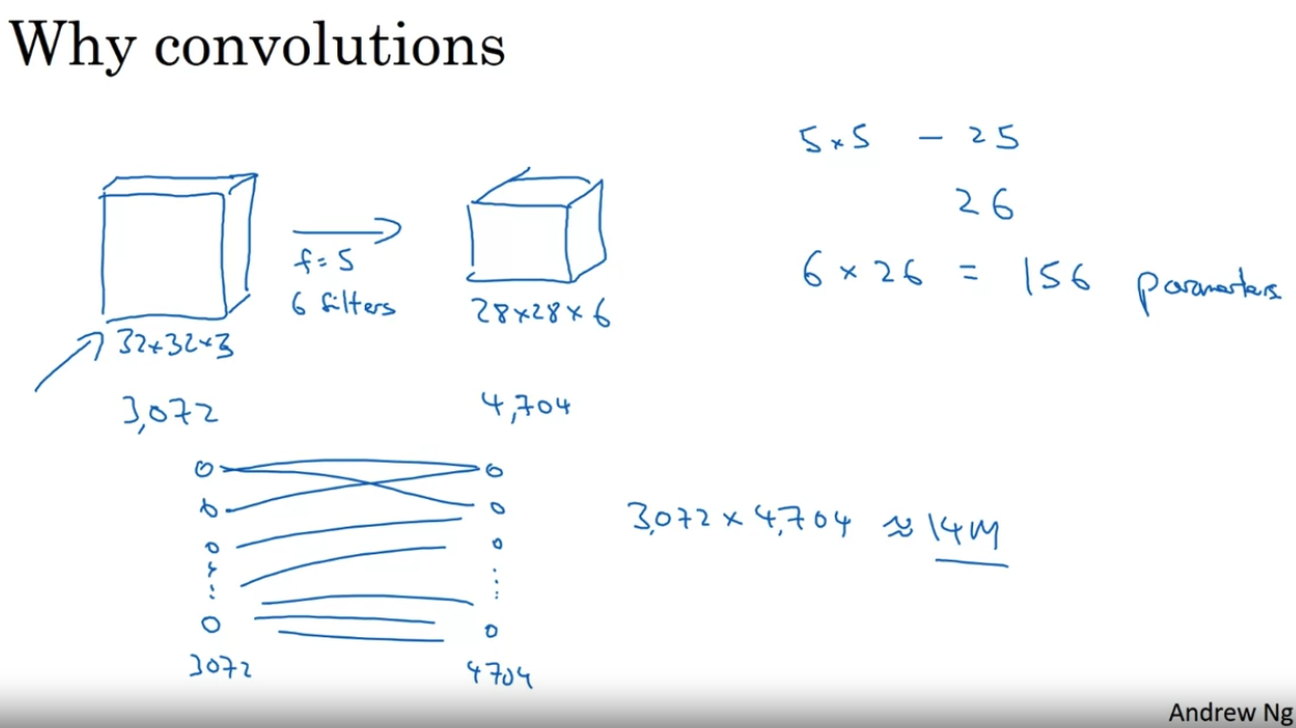 - Following above example, if we use Fully-connected layer instead of Convolutional layer, we should connect 3,072 and 4,704 neurons.
