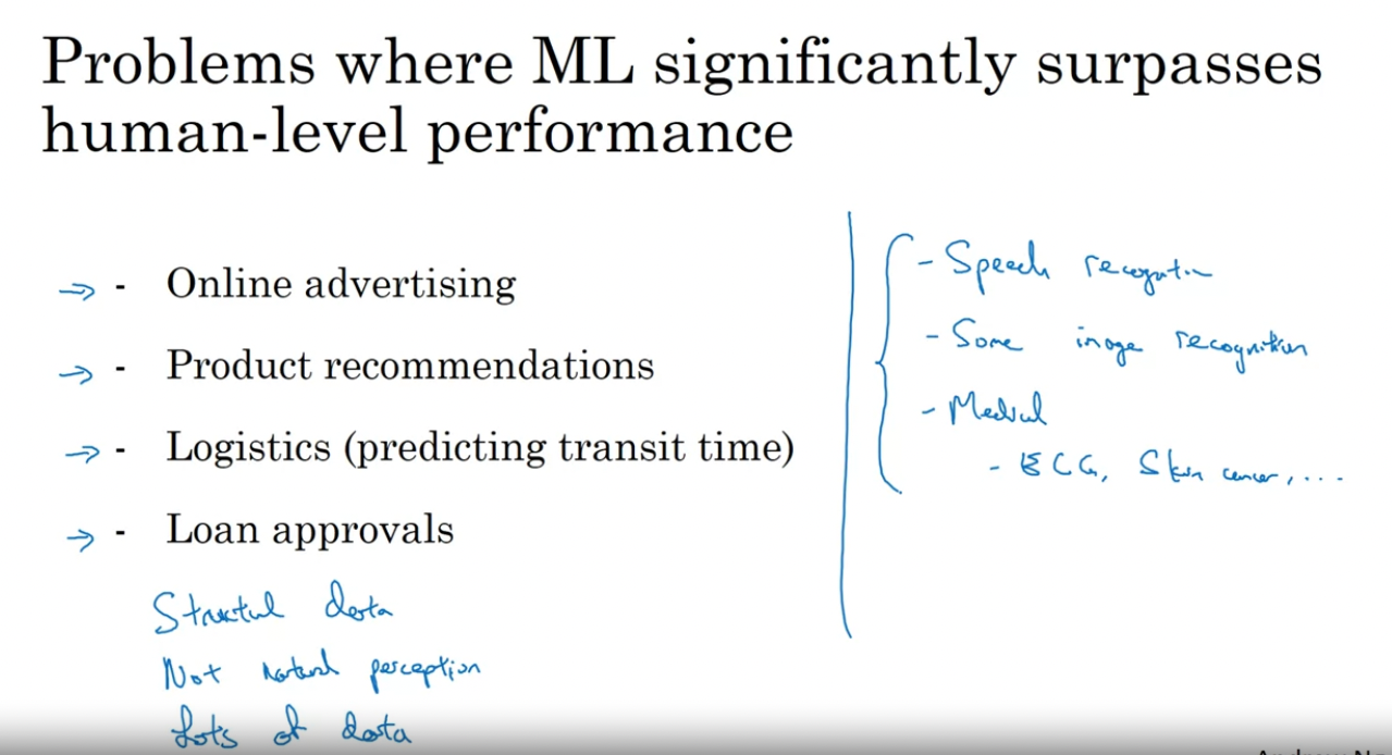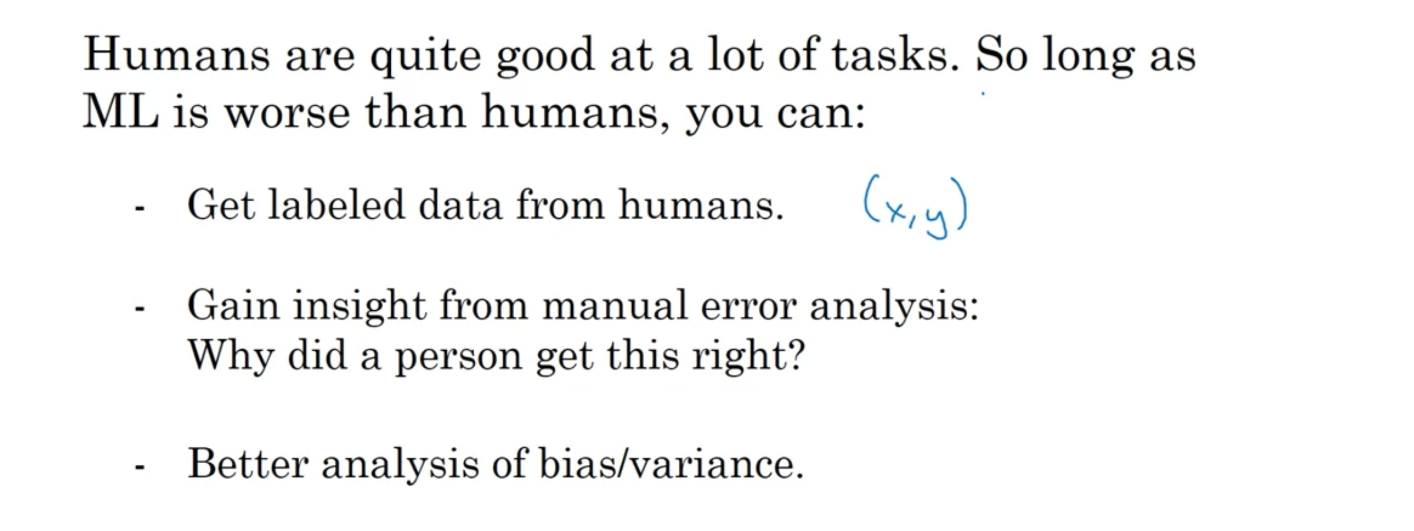 - 위에서 언급한 것과 같이 인간의 능력으로 해당 문제를 얼마나 잘 해결할 수 있는지 측정하는 것(bias, variance, ...)은 해당 문제를 해결하는 머신러닝 모델을 향상시키는데에 도움을 줌