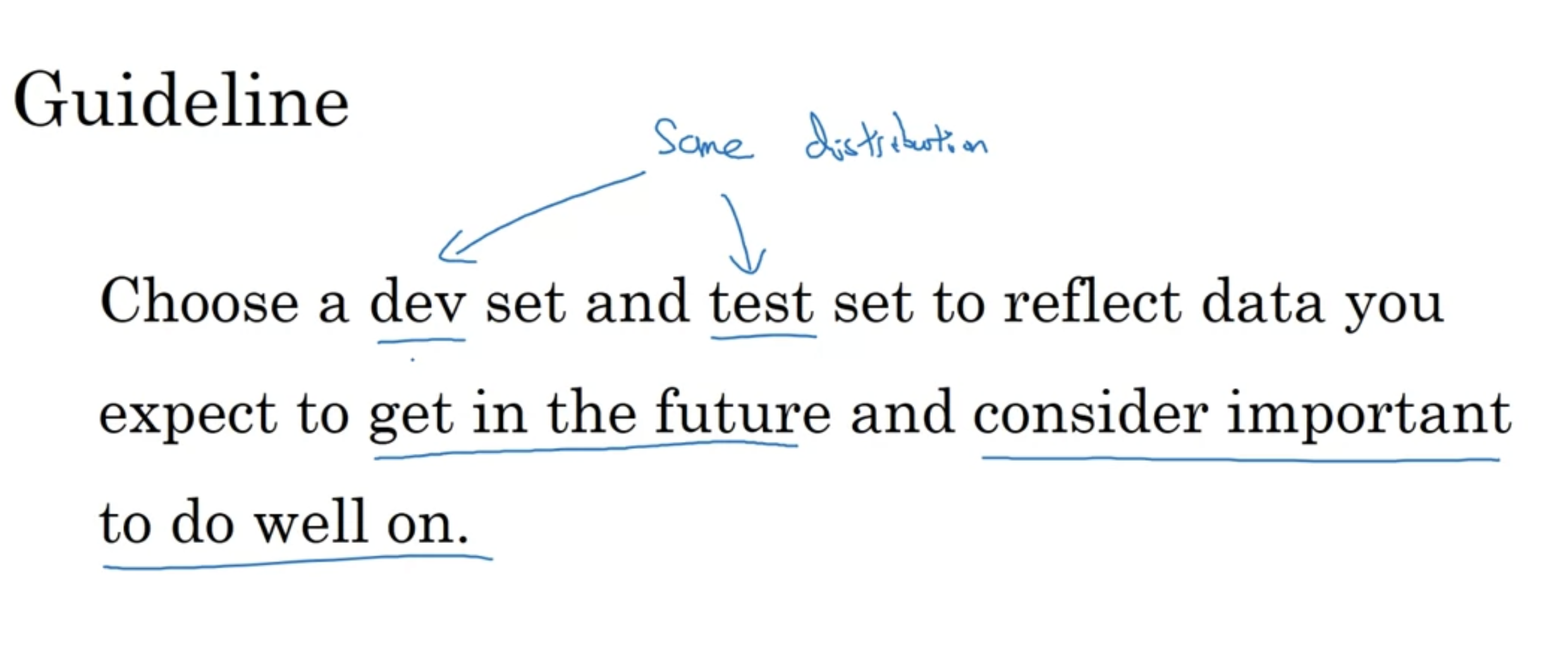 - Development set(hold out cross validation set)과 Test set은 같은 distribution에서 추출해야합니다.