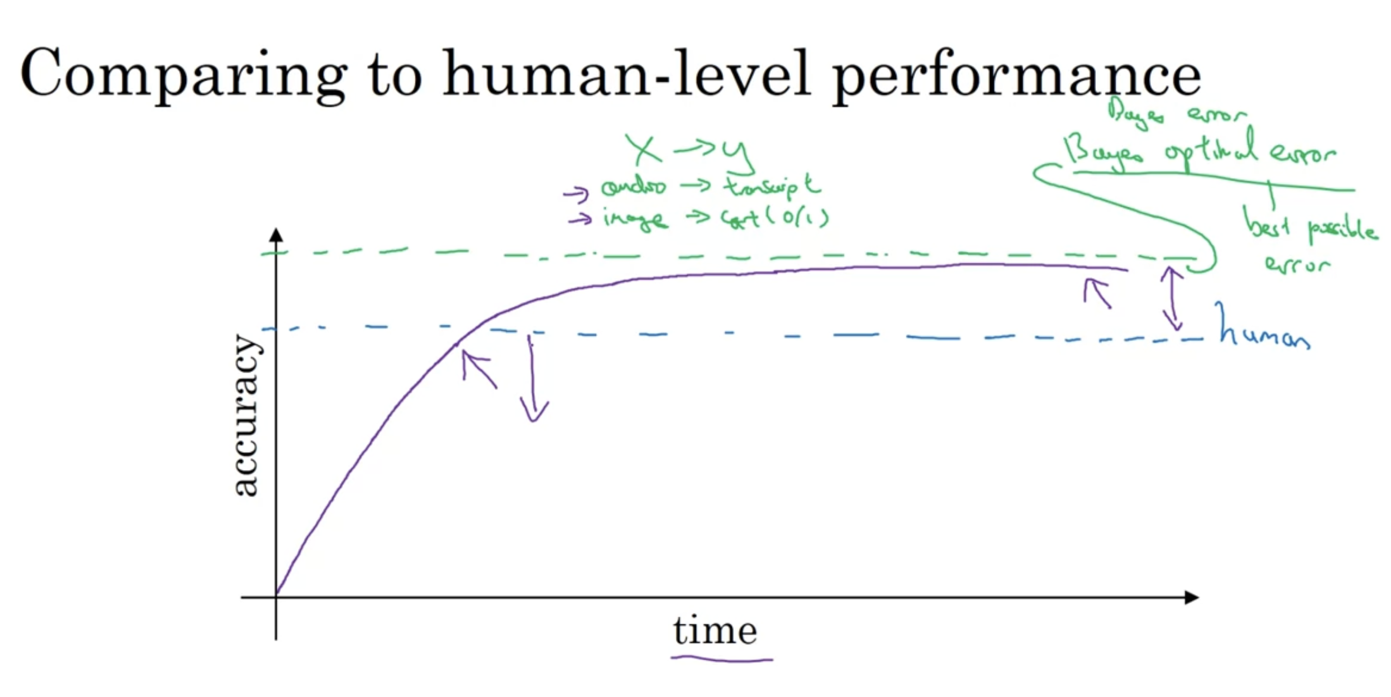 - 머신러닝 알고리즘들이 human level performance를 달성하기 까지는 굉장히 가파르게 향상되다가 Bayes optimal error에 도달하기 까지는 느린 속도로 향상되는 이유: