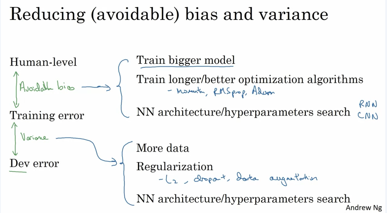 - 위의 예시에서는 Avoidable Bias는 0.5%이고 Measure of Variance(training error와 dev error의 차이)는 2%이므로 variance를 줄이는 것이 합리적인 판단임
