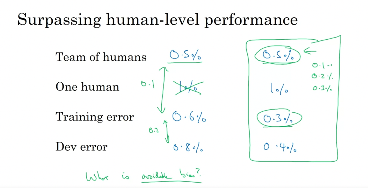 - 이 예시를 통해서 알 수 있는 점은 모델의 향상에 있어서 Human level performance의 극한이 어디인지를 파악하는 것은 굉장히 중요함