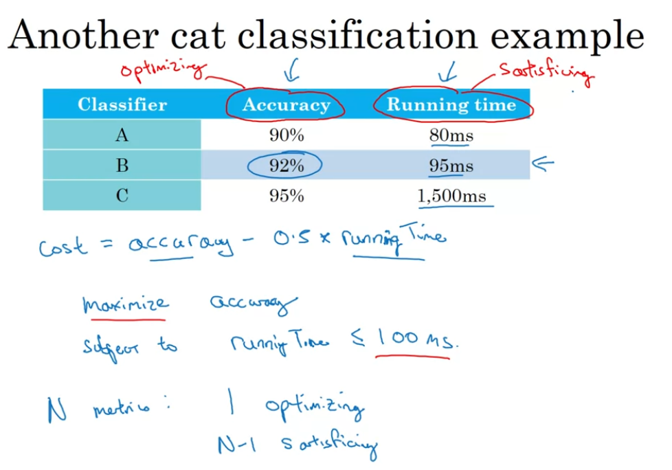 - 위의 예시에서는 running time을 100ms 이하로 설정하고(satisficing metric), accuracy를 최대치로 갖는(optimizing metric) 모델을 최고 성능 모델로 정의하였습니다.