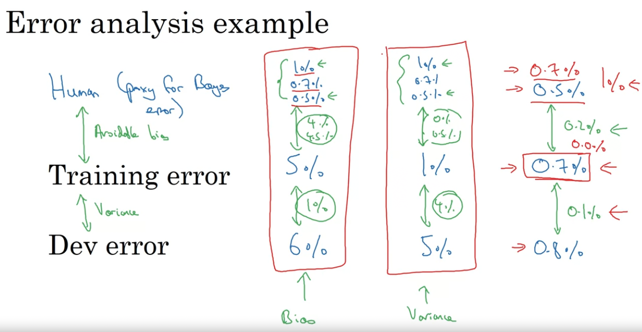 - 위의 예시에서는 Avoidable Bias는 0.5%이고 Measure of Variance(training error와 dev error의 차이)는 2%이므로 variance를 줄이는 것이 합리적인 판단임