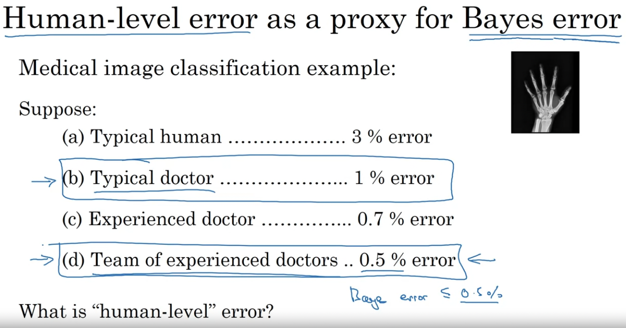 - 하지만, 모델의 목적성에 따라서 이는 달라질 수 있음: 만약 Typical doctor 보다 나은 모델이면 deploy 할거라는 계획을 가졌다면 Bayes error를 1%라고 잡을 수도 있음(0.5%가 가장 최선의 Bayes error라는 사실은 변함없음)