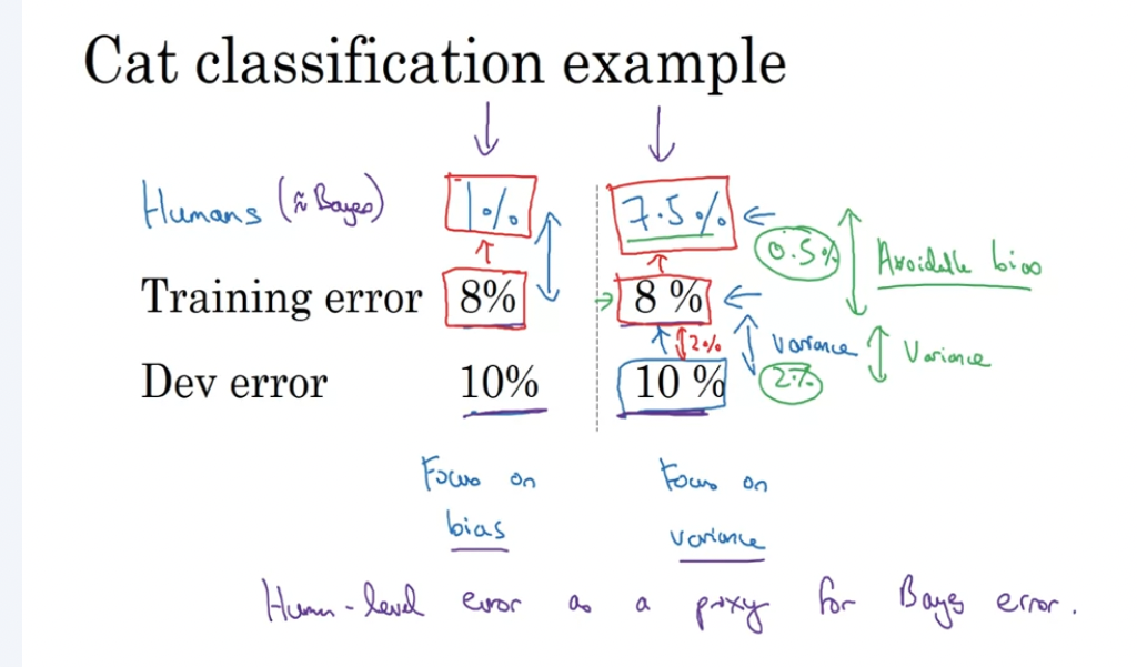 - 0.7%로 알았다면 Avoidable bias는 0%이므로 variance를 줄이려는 방향으로 프로젝트가 진행될 가능성이 큼