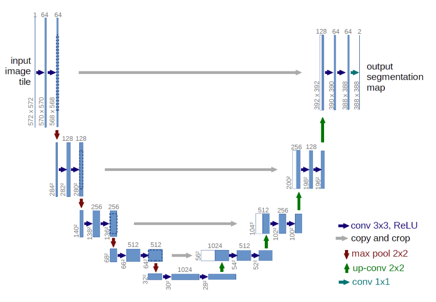 - The architecture used is the so-called U-Net, which is very common for image segmentation problems such as this.