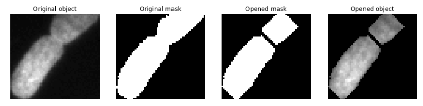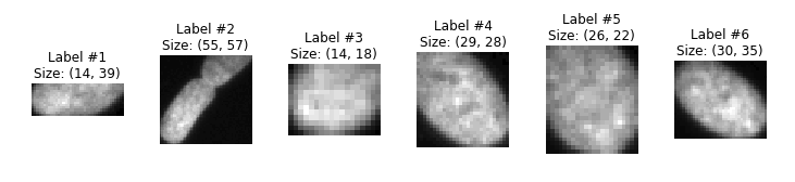 - Using ndimage.find_objects, we can iterate through our masks, zooming in on the individual nuclei found to apply additional processing steps.