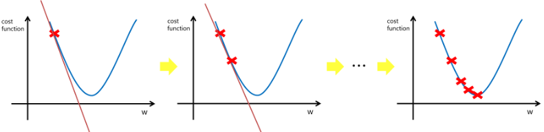 결론적으로 기울기값이 아래 이미지와 같이 w의 값이 커짐에 따라 편미분을 통해 구한 변화율의 값은 작아지고 이는 접선의 경사(기울기)를 뜻하므로 "경사하강법"이라는 이름이 붙은 것이다.